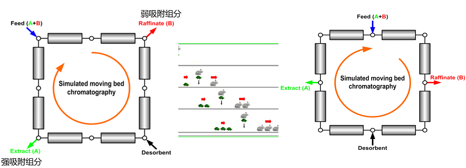 SMB色譜分離技術(shù)是20世紀60年代發(fā)展起來的一種連續(xù)逆流制備色譜,是一種可以用于層析、吸附、離子交換、梯度洗脫等一種連續(xù)運行的色譜設(shè)備主體,與吸附劑結(jié)合,多個單柱組合,通過“模擬移動”工藝可以實現(xiàn)高效、廉價、連續(xù)分離。模擬移動床色譜: 通過周期性地改變進出口的位置來實現(xiàn)固定相和流動相的逆流流動